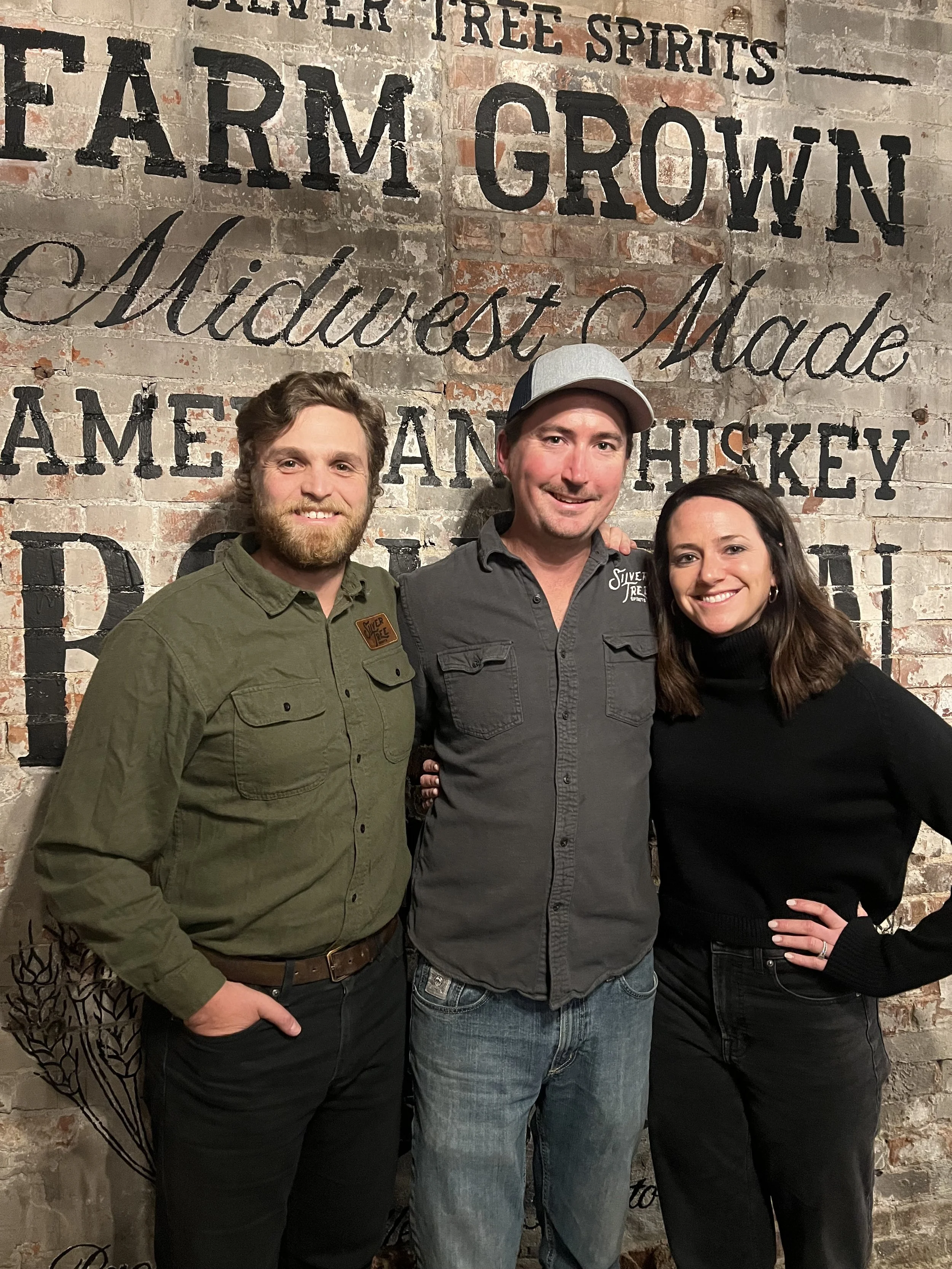 Photo: Nat (friend of the farm!), Will, and me at the 2025 Land Connection Dinner in Paxton, IL at Silver Tree Beer & Spirits.